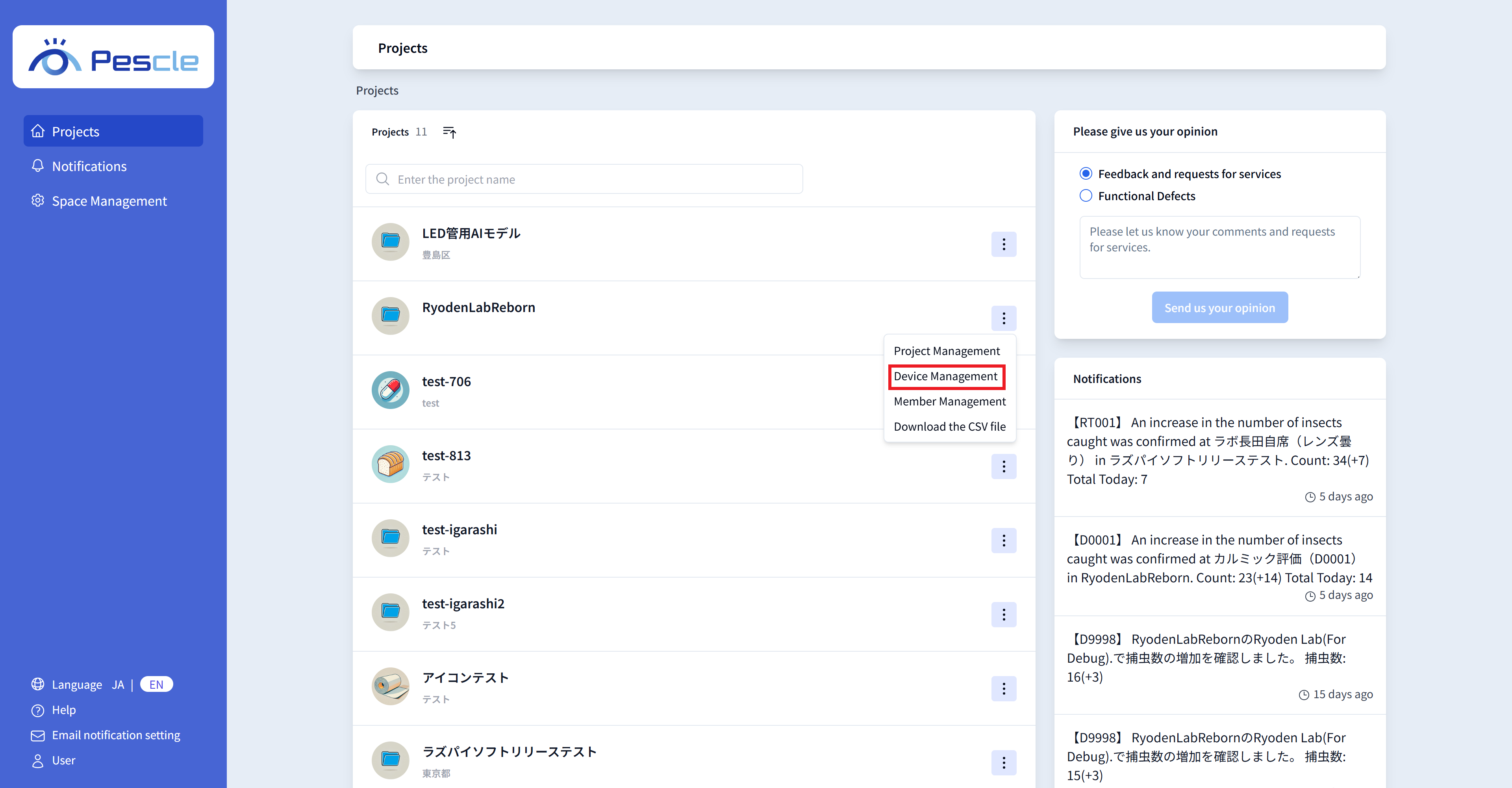 Click the vertical ellipsis on the right side of the project that the insect trap camera you want to view belongs to.