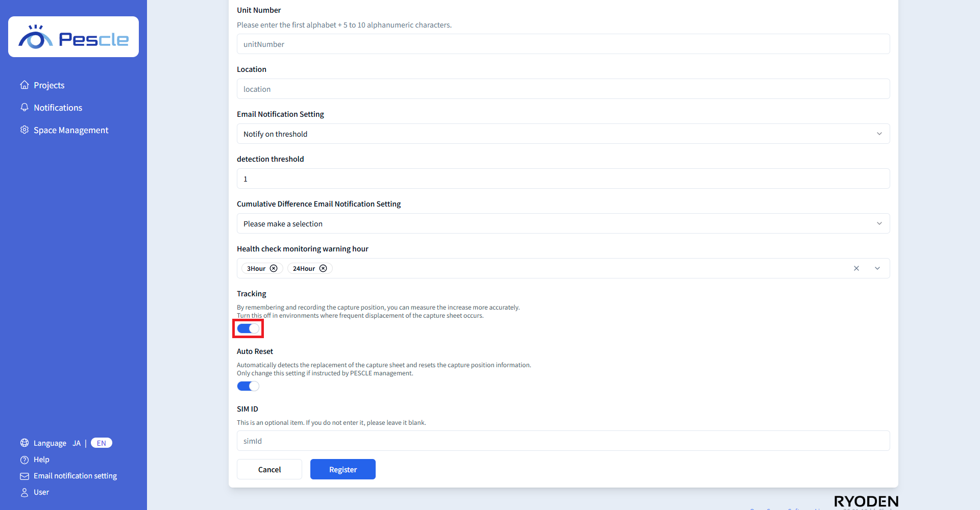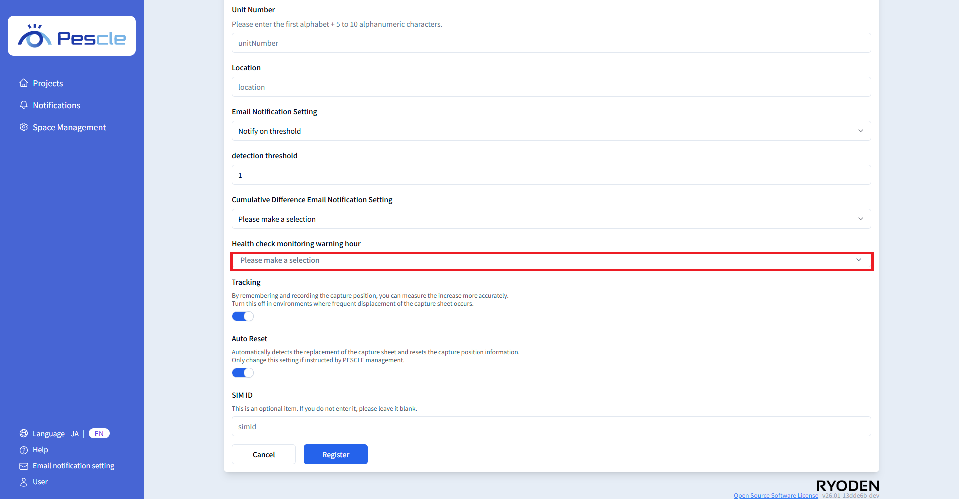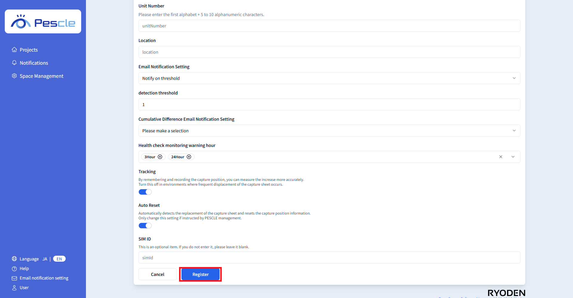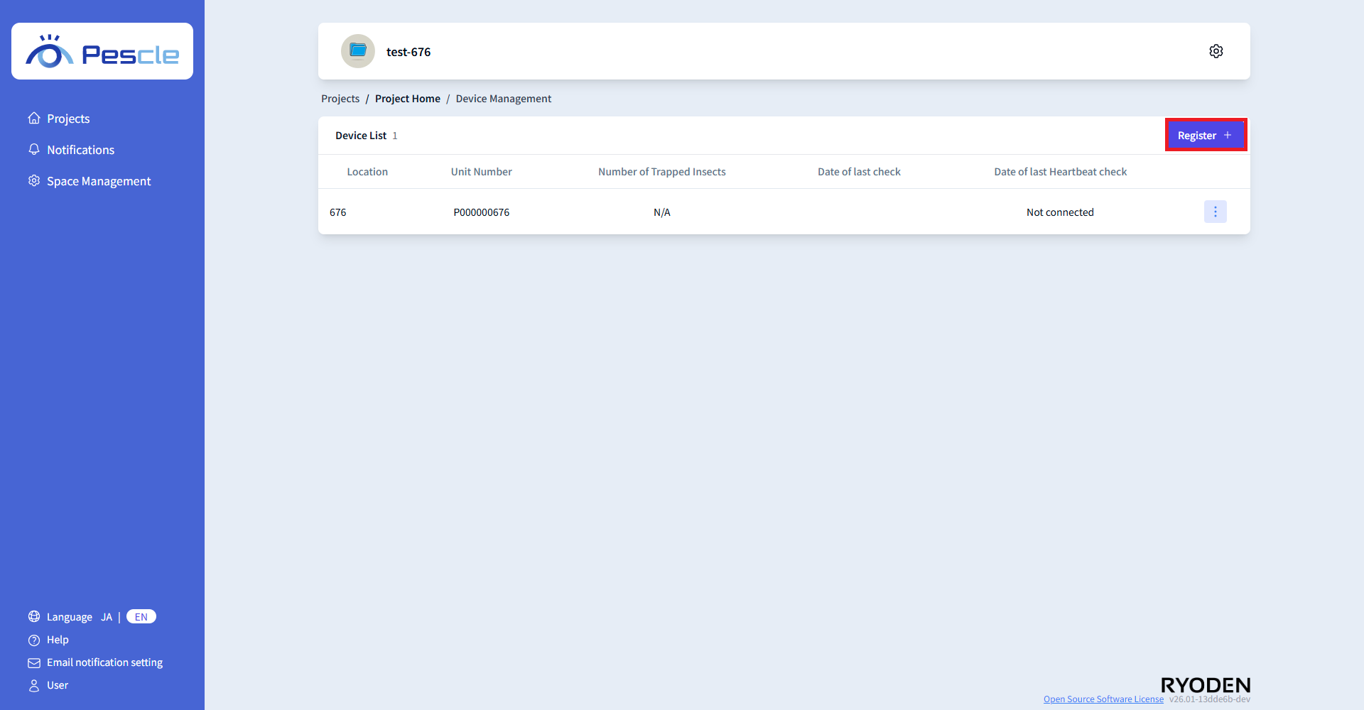 The insect trap camera management screen will be displayed. Click the “Register” button.