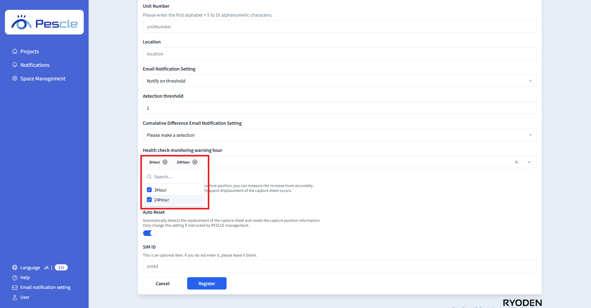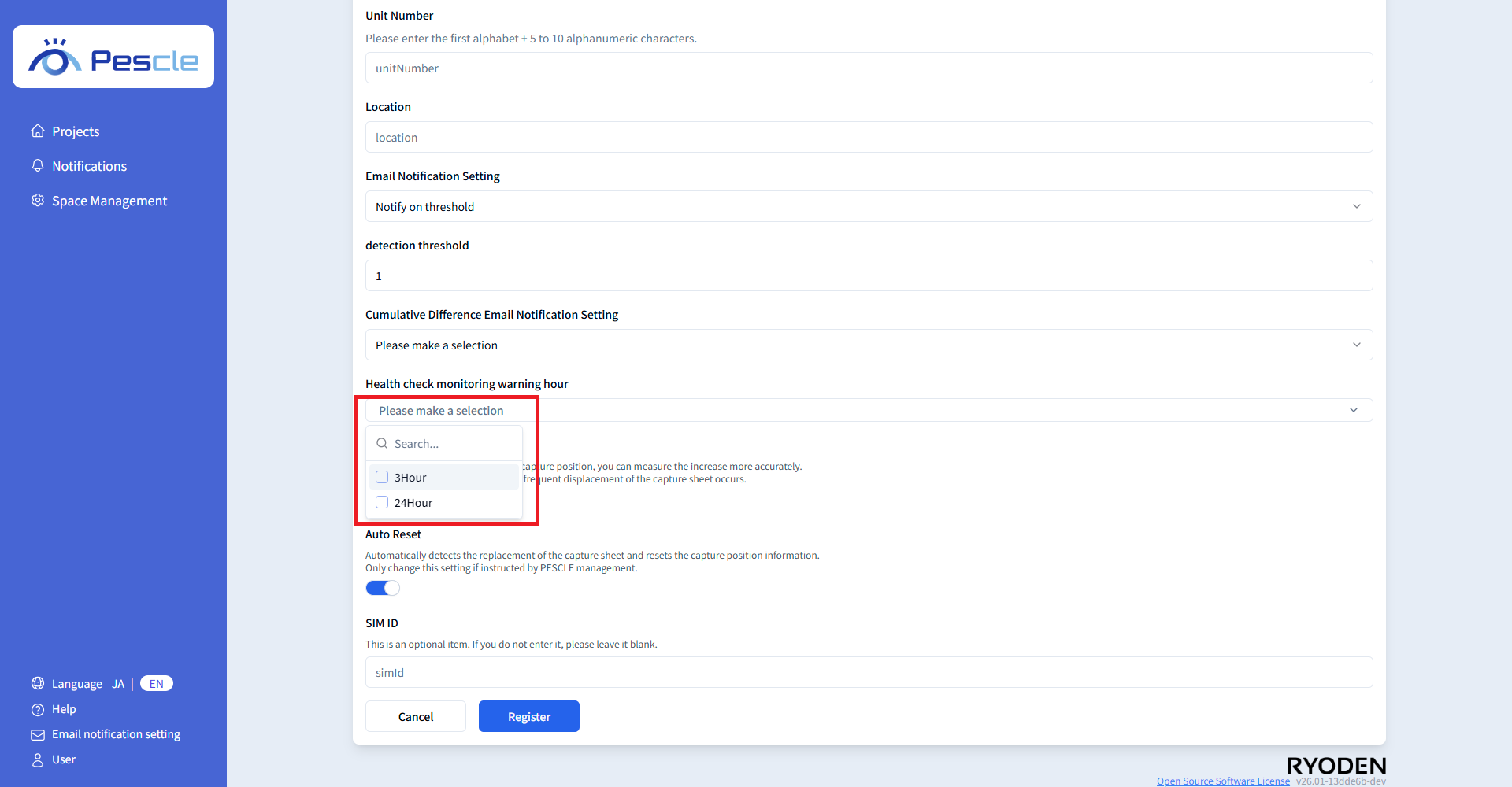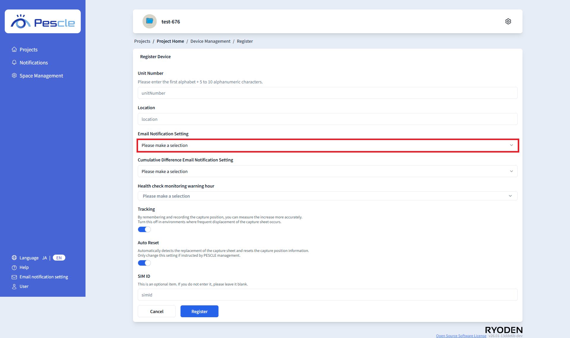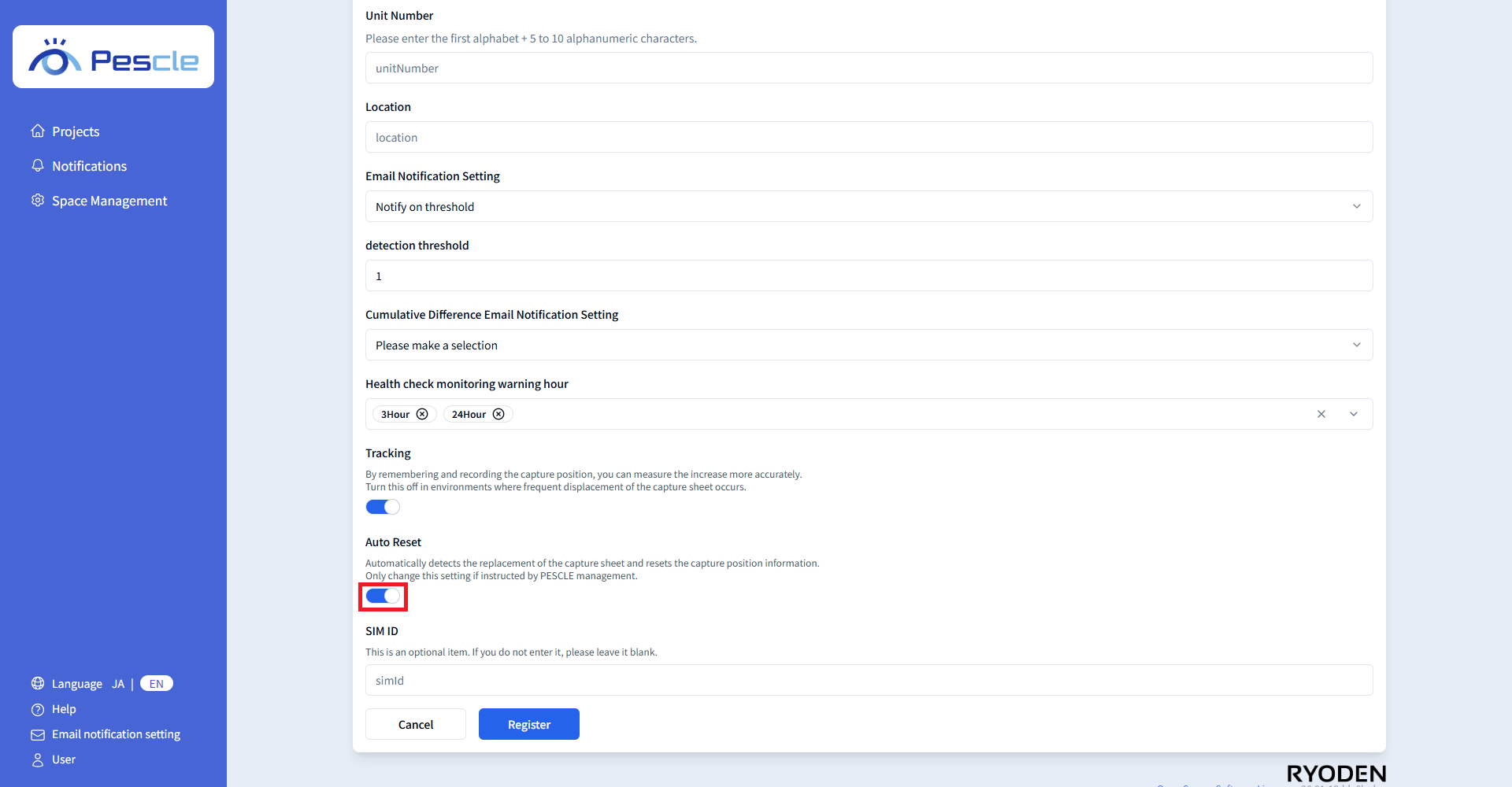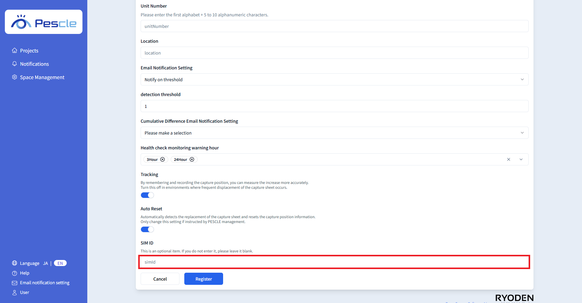 The insect trap camera management screen will be displayed. Click the “Register” button.