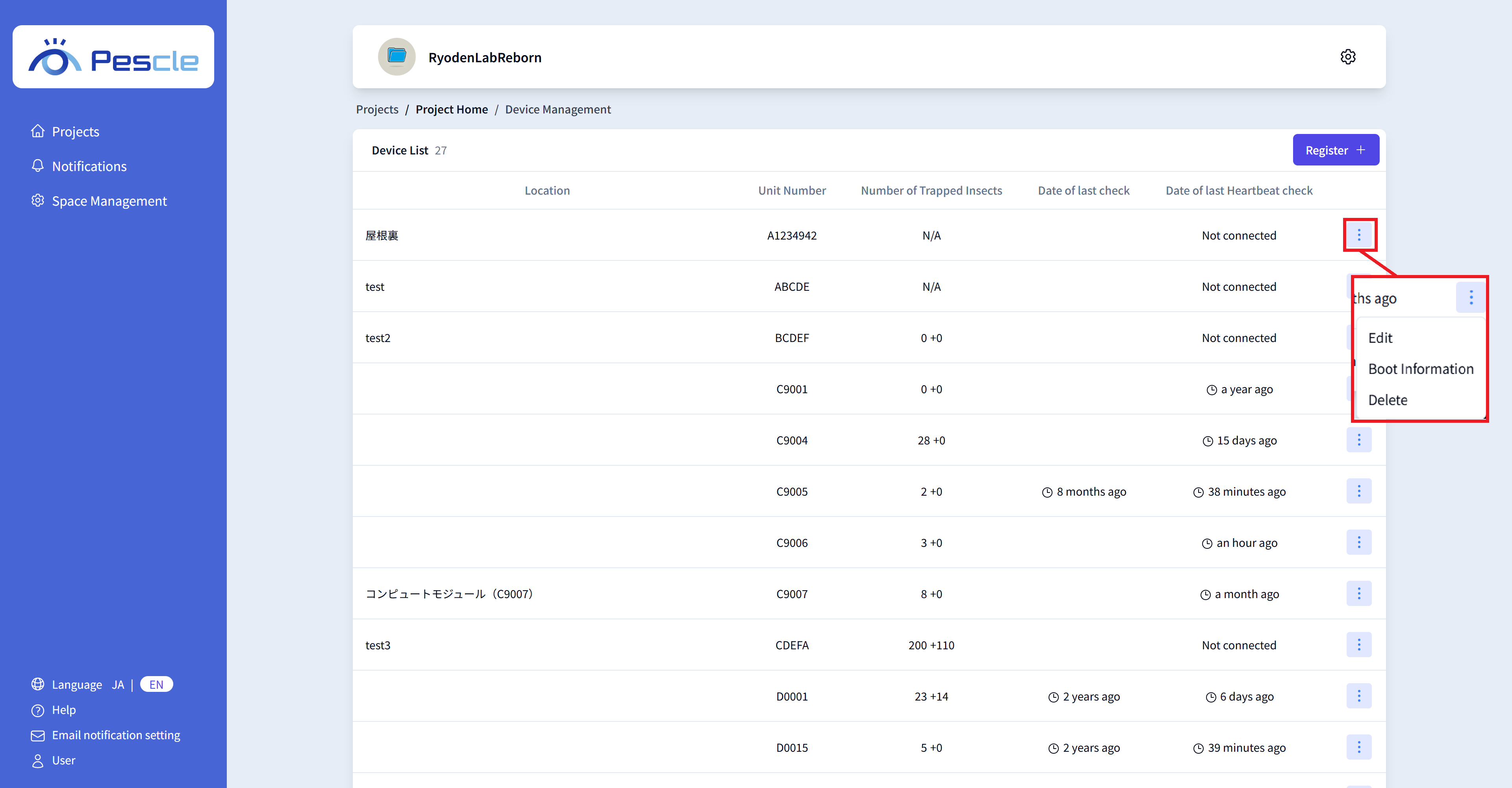 When the insect trap camera management screen is displayed, click the vertical three-dot menu on the right side of the target insect trap camera.
