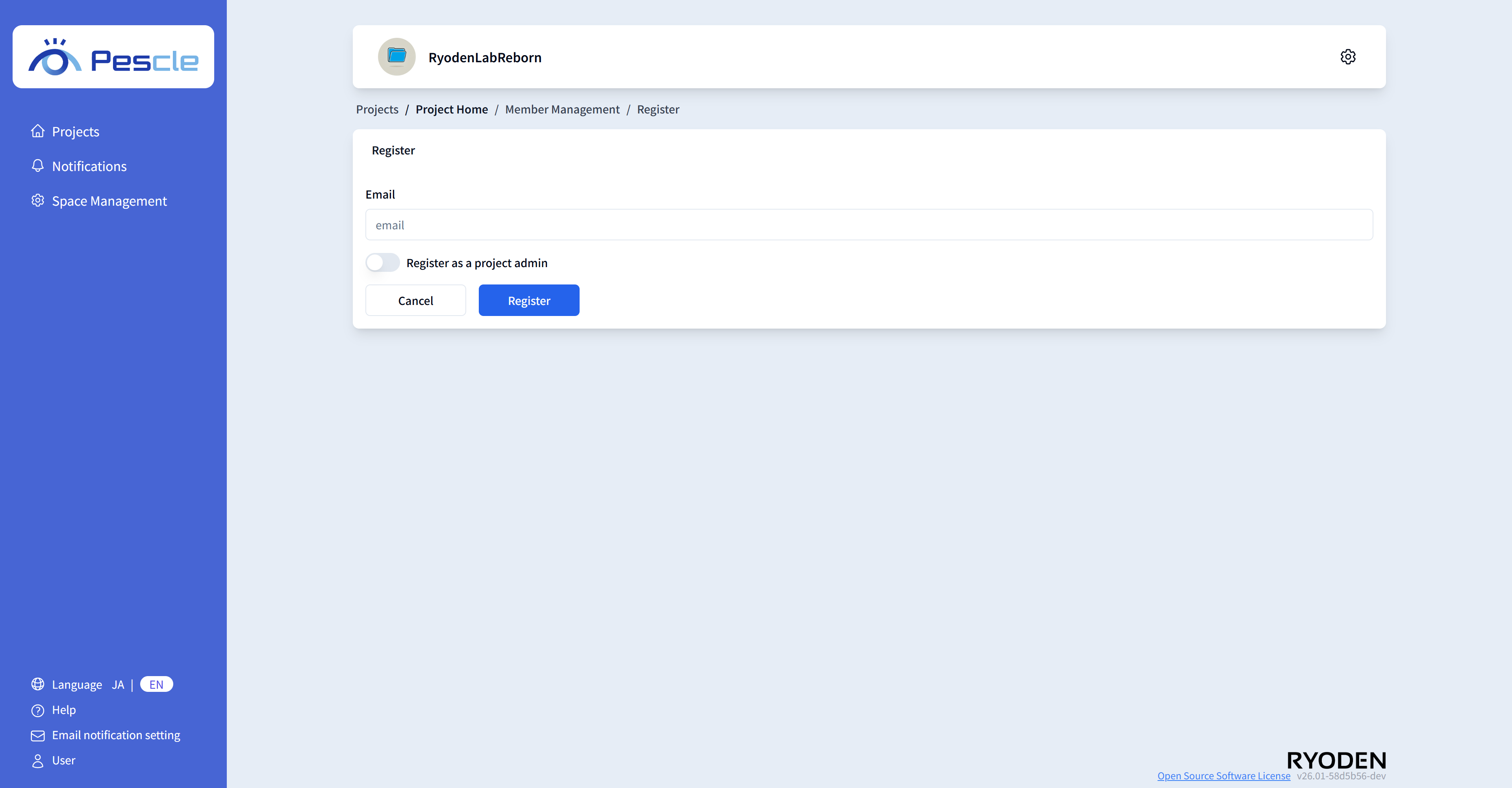 On the member registration screen, enter the email address and whether they are a project administrator.
