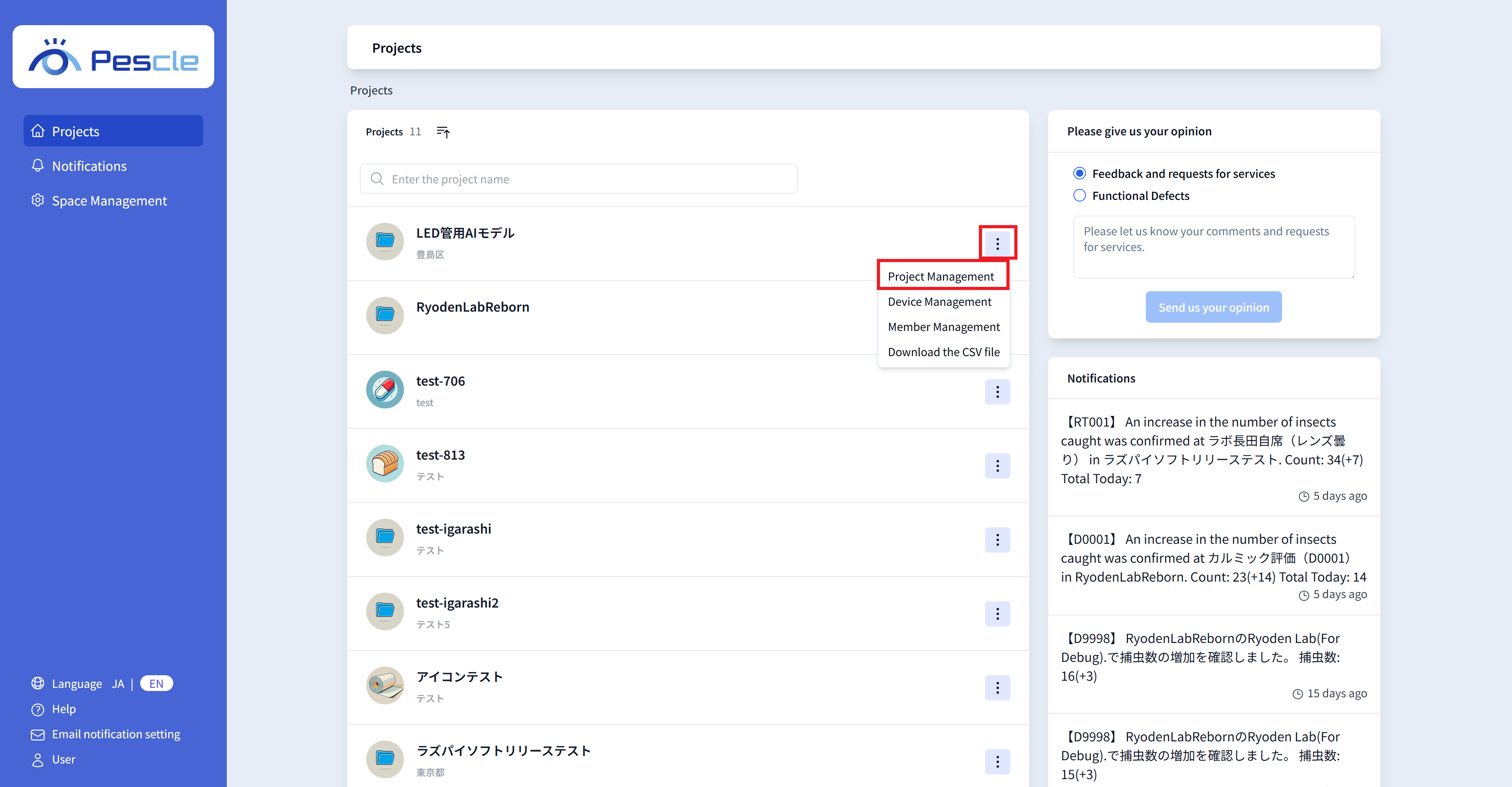 After signing in, the project list will be displayed. Click the vertical ellipsis on the right side of the project you want to change, then click ‘Project Management’.