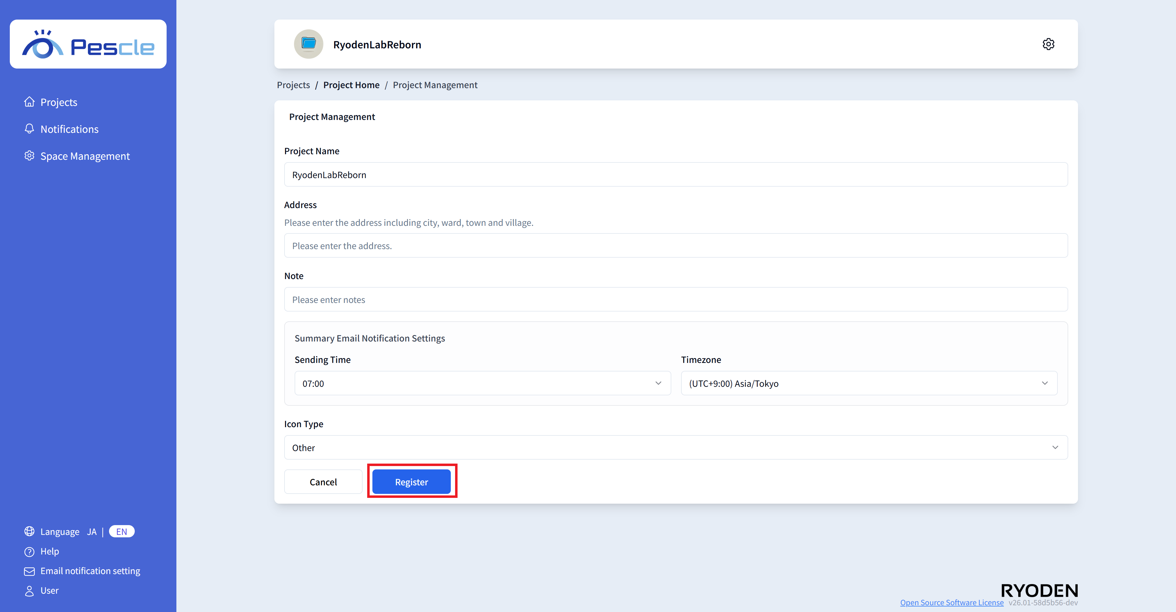 The Project Settings screen will be displayed. Enter the project name, address, notes, time zone, summary email sending time, and icon type.