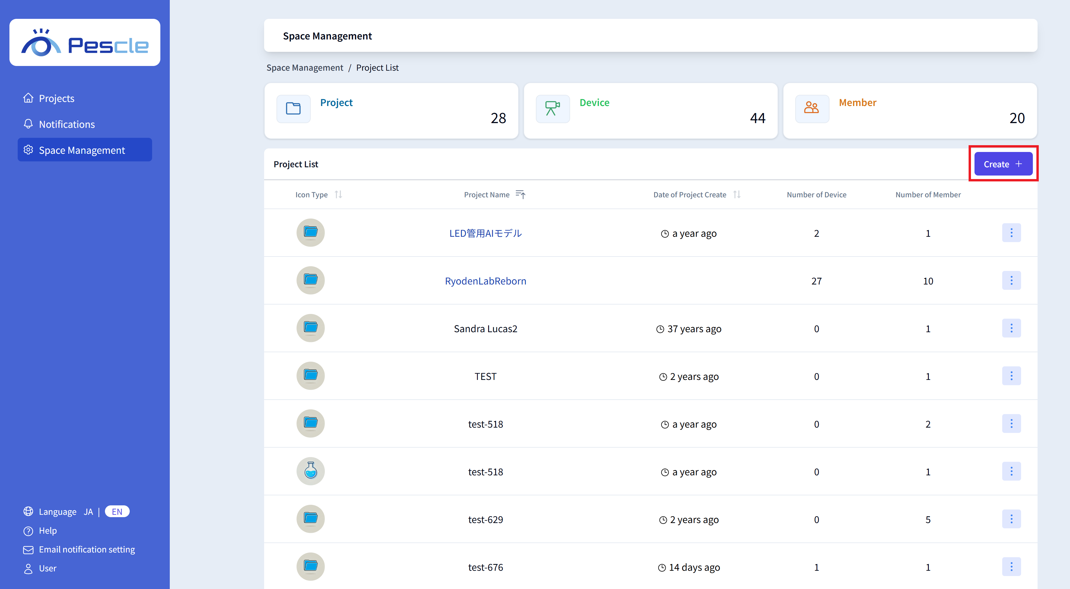 Once the space management screen is displayed, click the “Create” button.