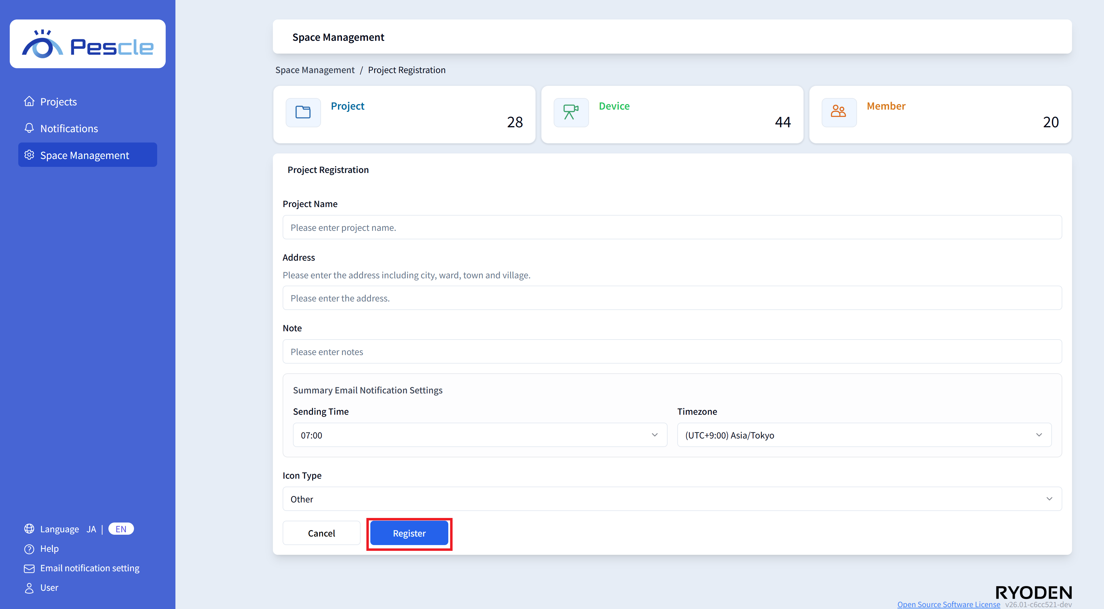 Once the project creation screen is displayed, enter the project name, address, notes, time zone, summary email delivery time, and icon type.