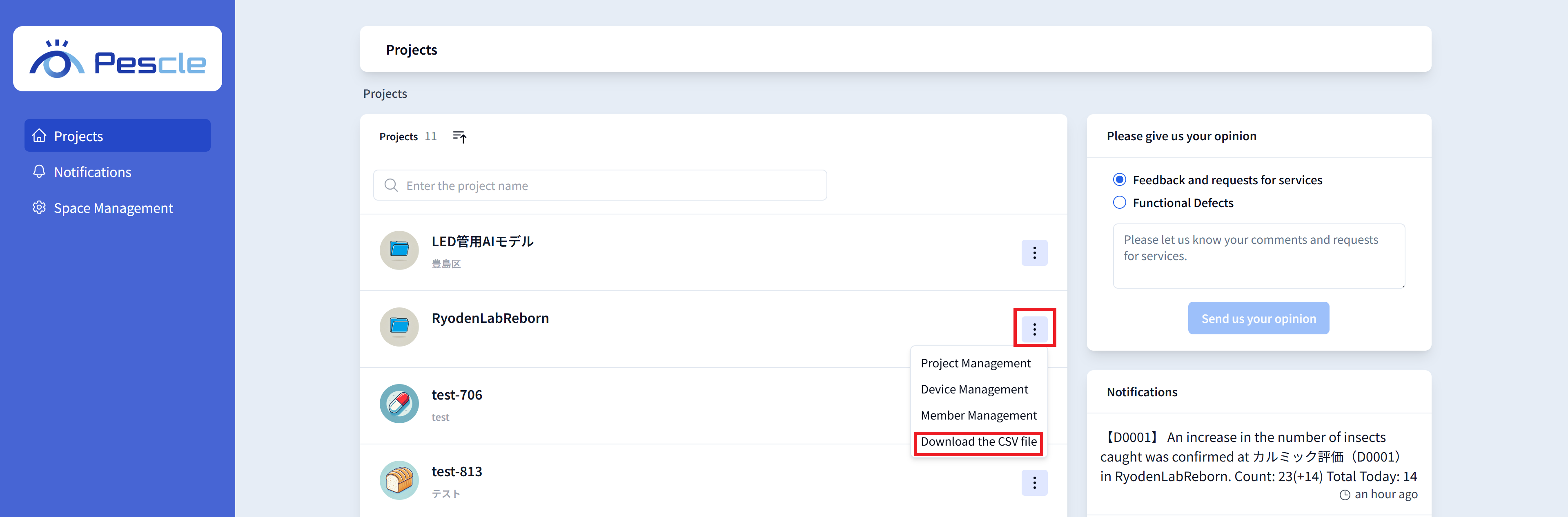 Click the vertical three-dot menu on the right side of the project. When the submenu appears, click ‘Download the CSV file.’