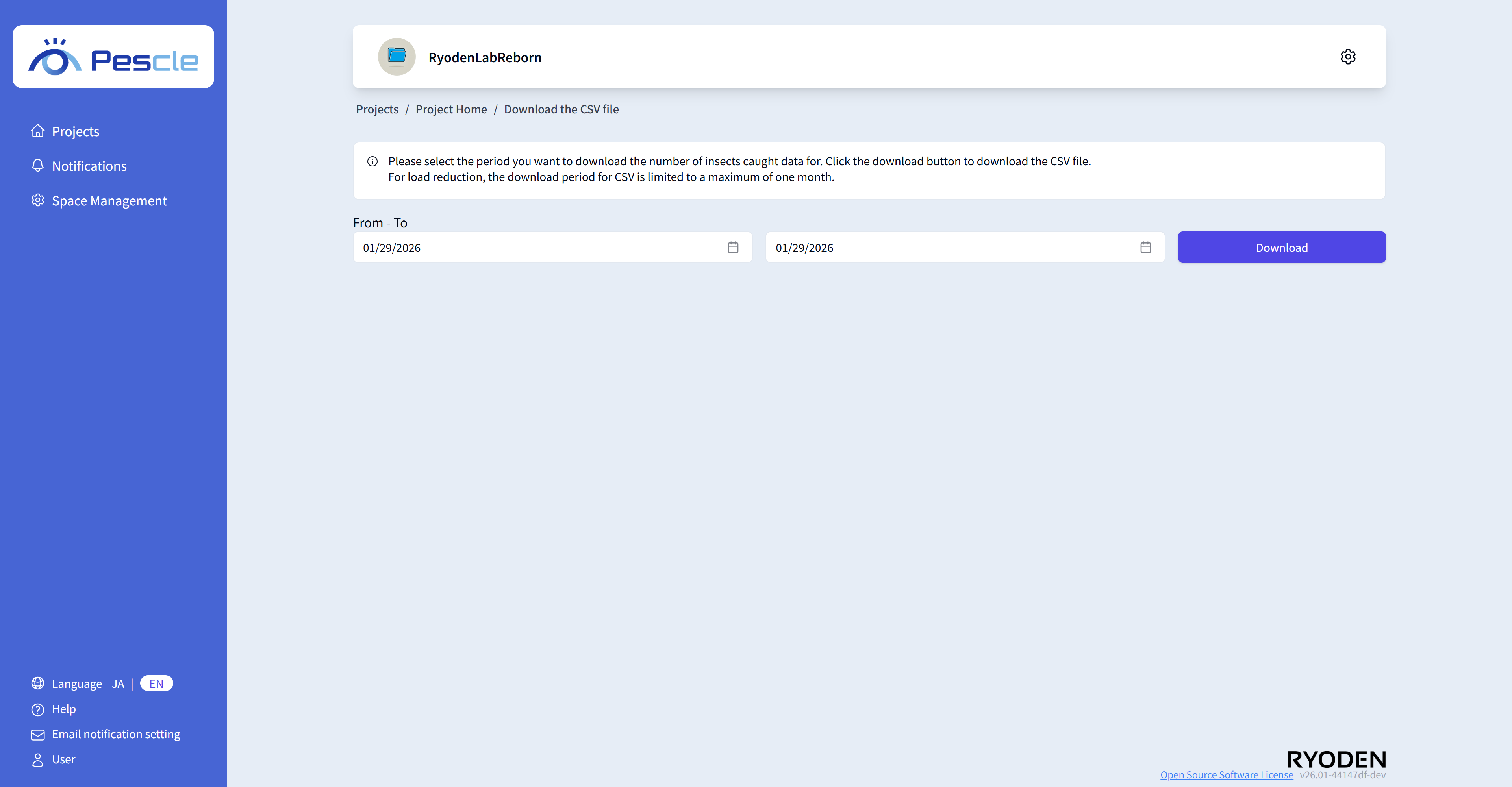 When the CSV Download screen appears, select the ‘Start Date’ and ‘End Date,’ then click the ‘Download’ button.