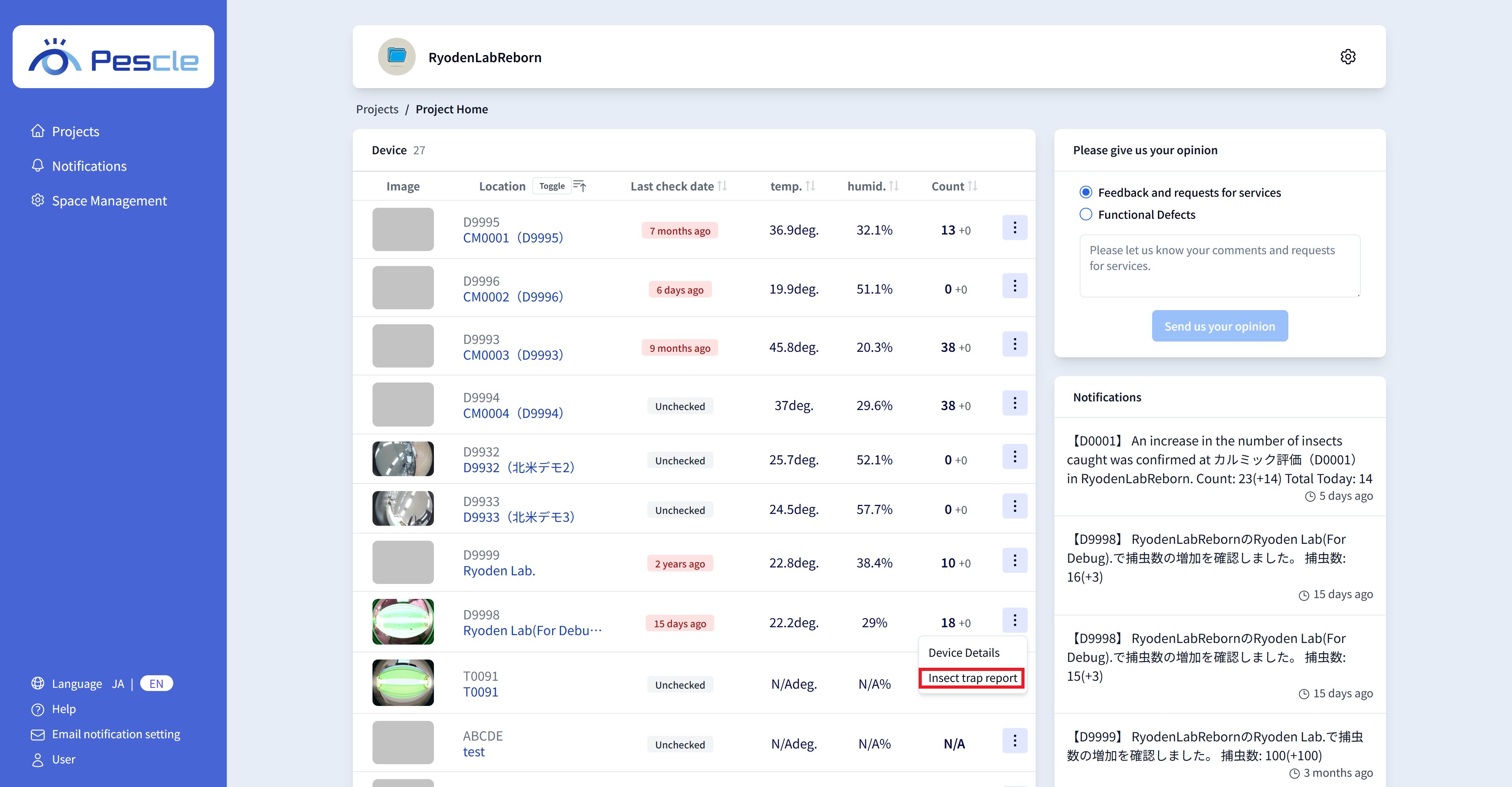 プロジェクトホーム画面が表示されるので、見たい捕虫器カメラの右側にある縦三点リーダーをクリックします。