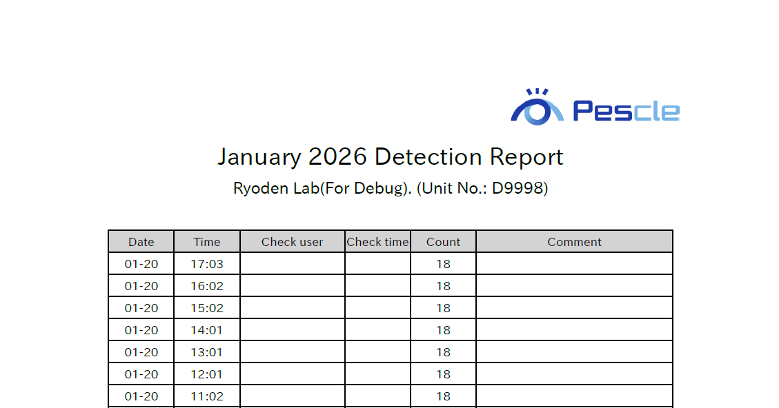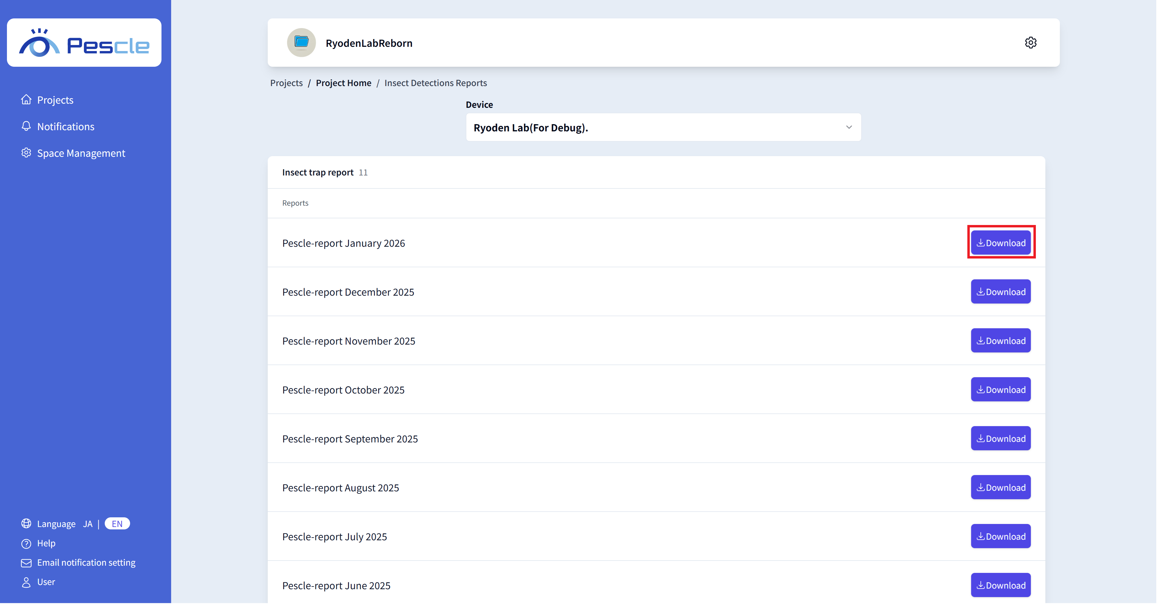 「虫検出レポート」画面では虫検出レポートを月毎にPDF形式でダウンロードできます。