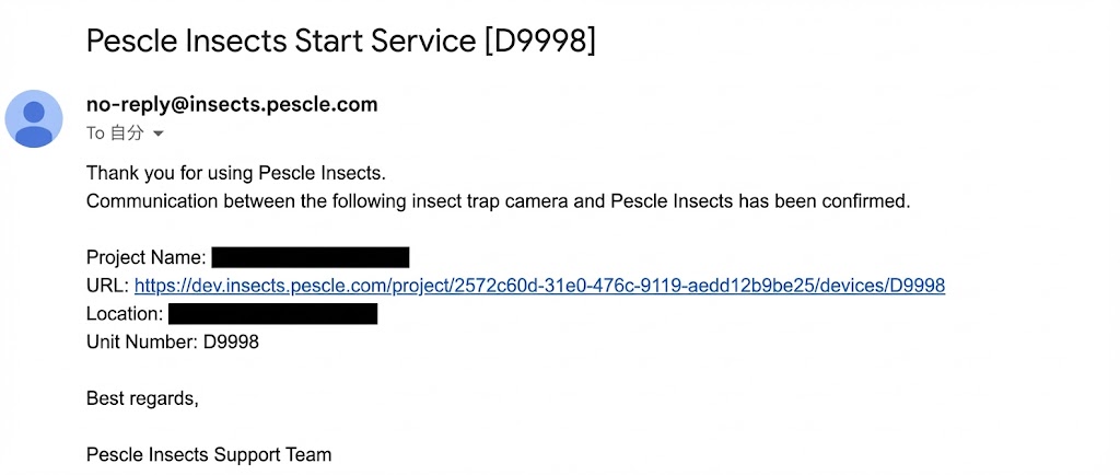 Pescle Insects sends an email when the device camera is operated for the first time. This section explains how to check the device details from the link in the email you receive.