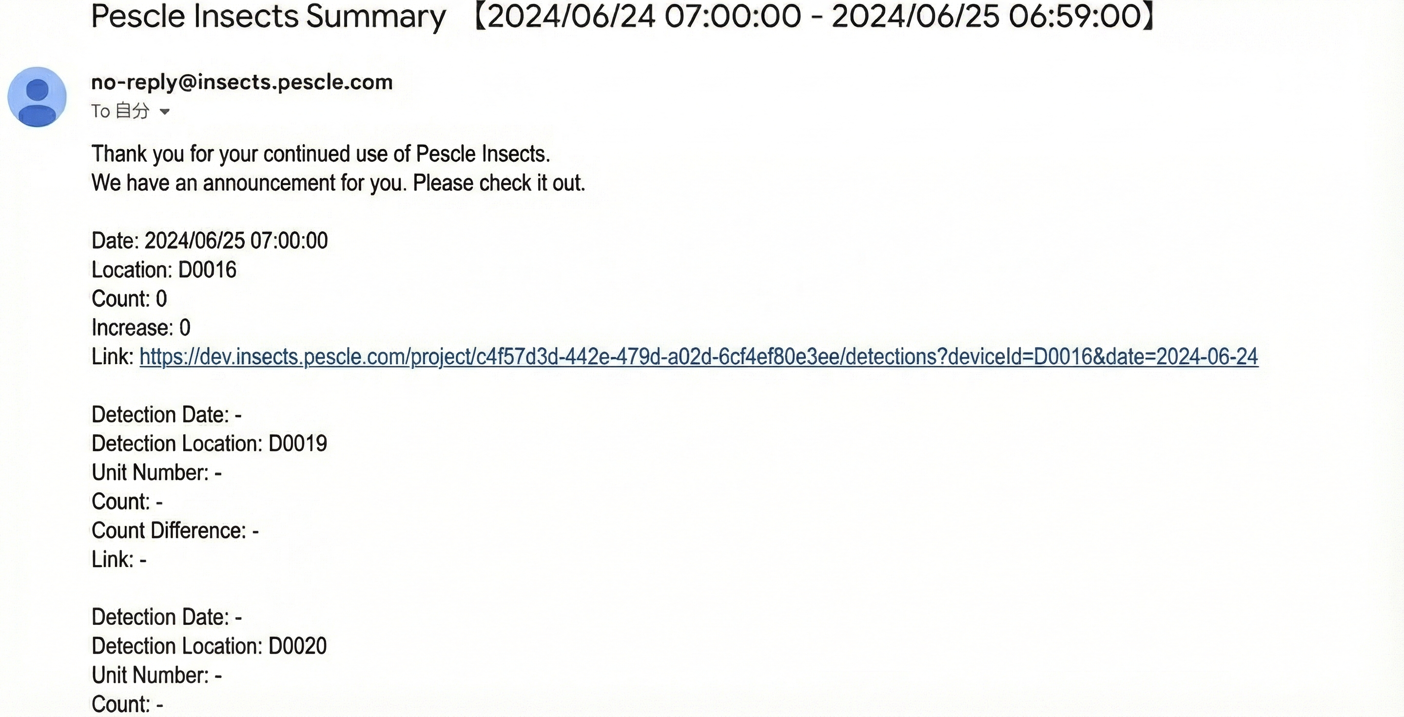 Pescle Insects sends a summary email daily for each project at the summary email delivery time configured in the project settings. This section explains how to check from the link in the email you receive.
