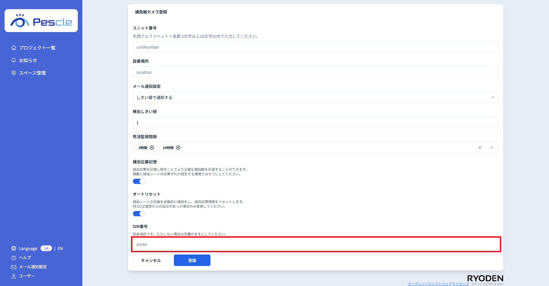 捕虫器カメラの SIM 番号を入力することが可能です。 任意ですので、不要であれば入力が無くとも問題ありません。