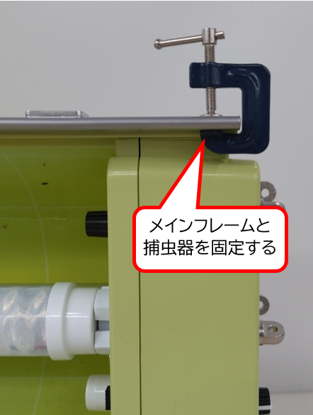 捕虫器カメラが落下しないよう、市販のクランプなどを利用し、本体をしっかりと固定してください。ぐらつきがないことを必ず確認してください。捕虫シートのズレ防止