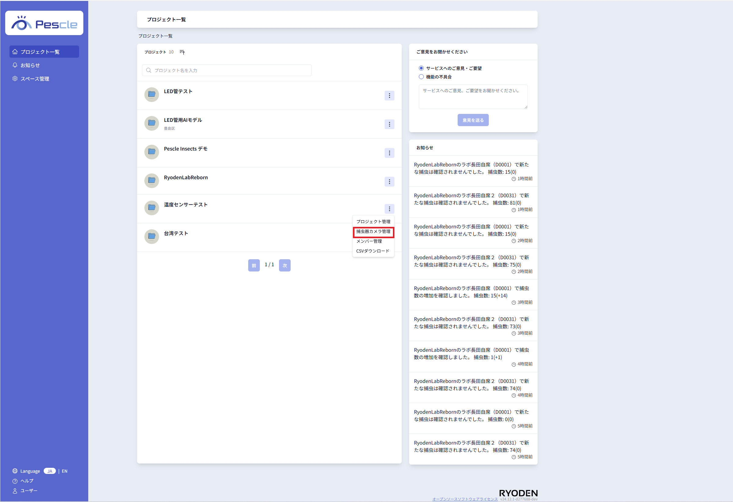 サブメニューが表示されたら、「捕虫器カメラ管理」をクリックします。
