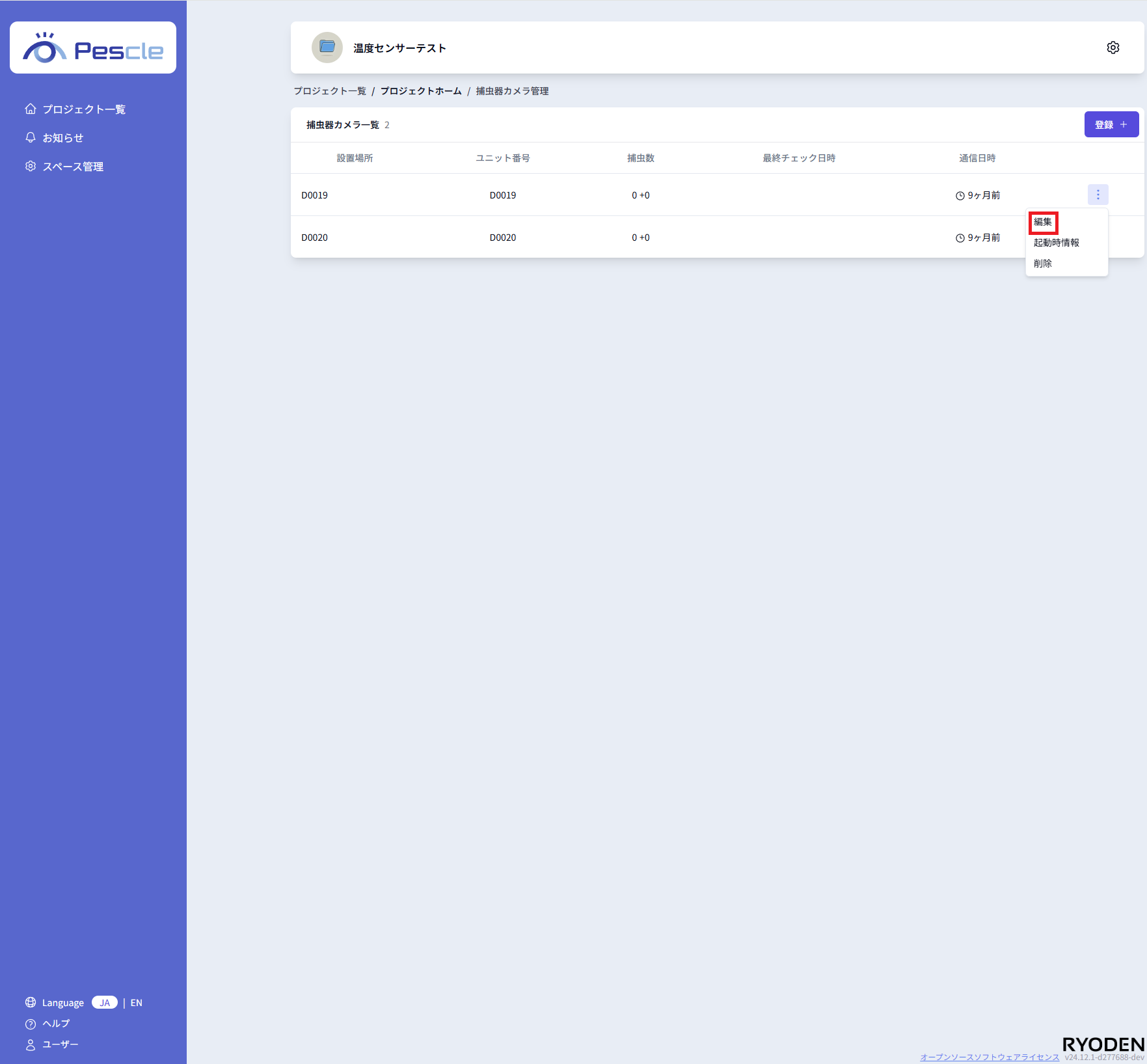 見たい捕虫器カメラが所属するプロジェクトの右側にある縦三点リーダーをクリックします。