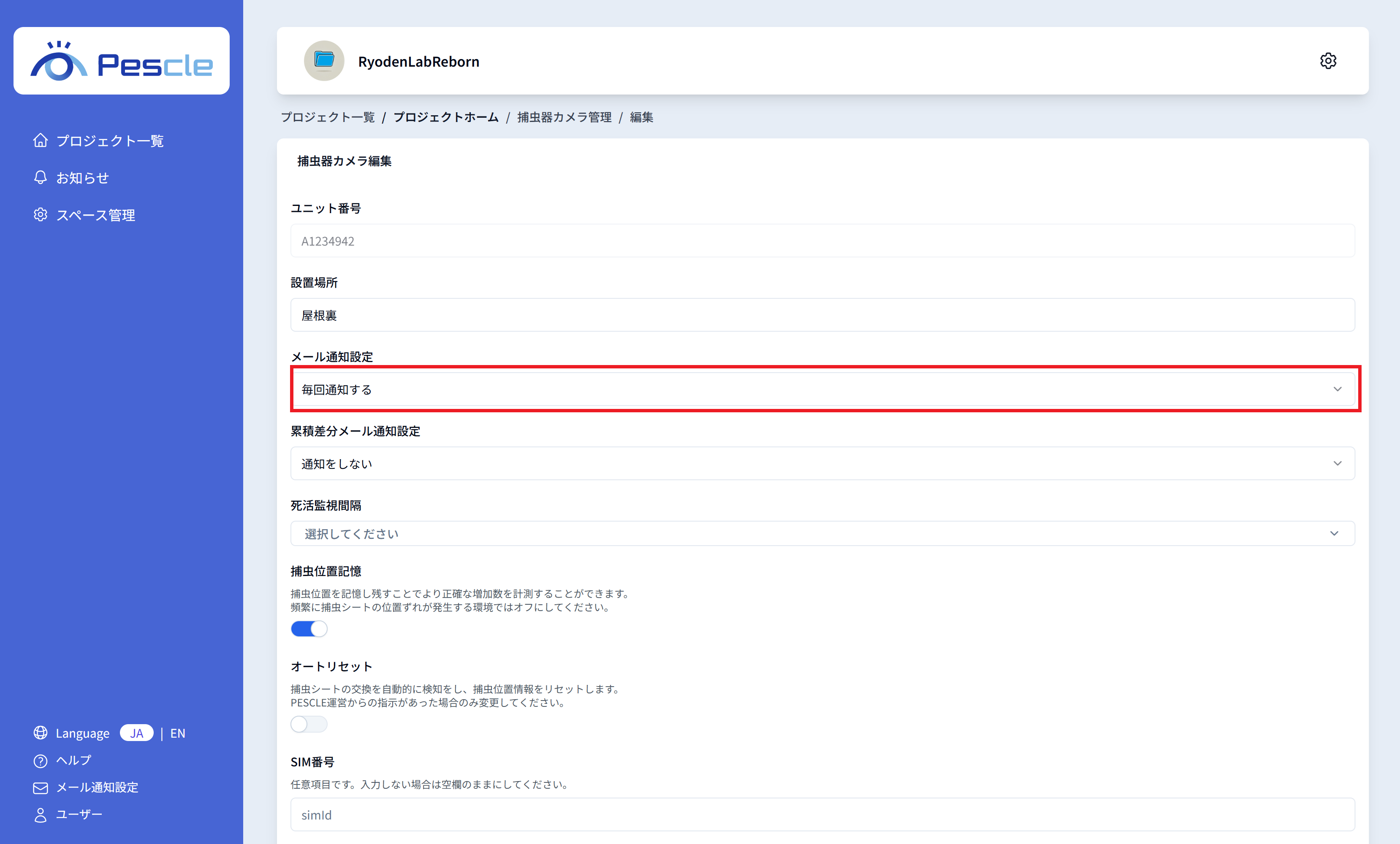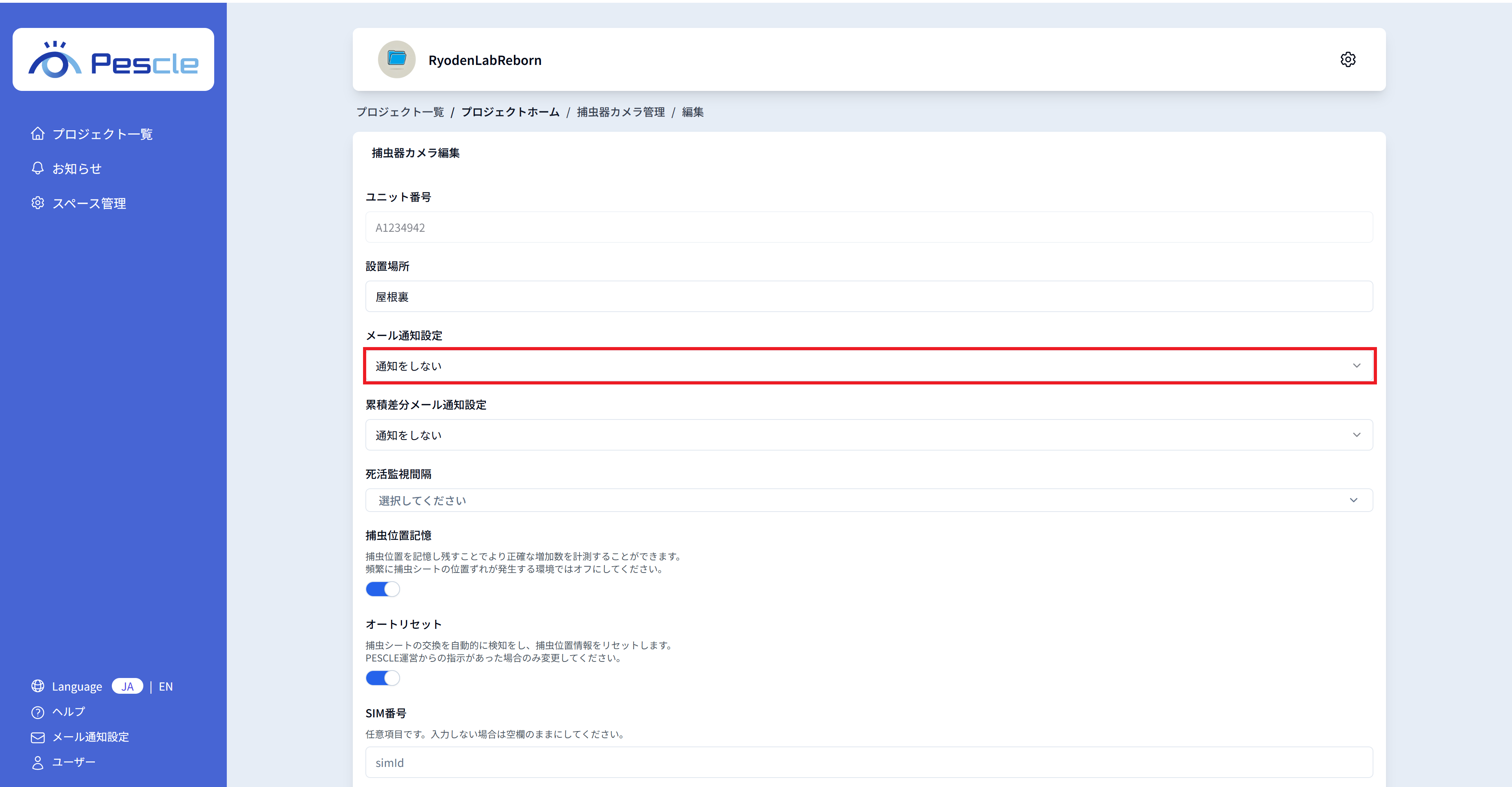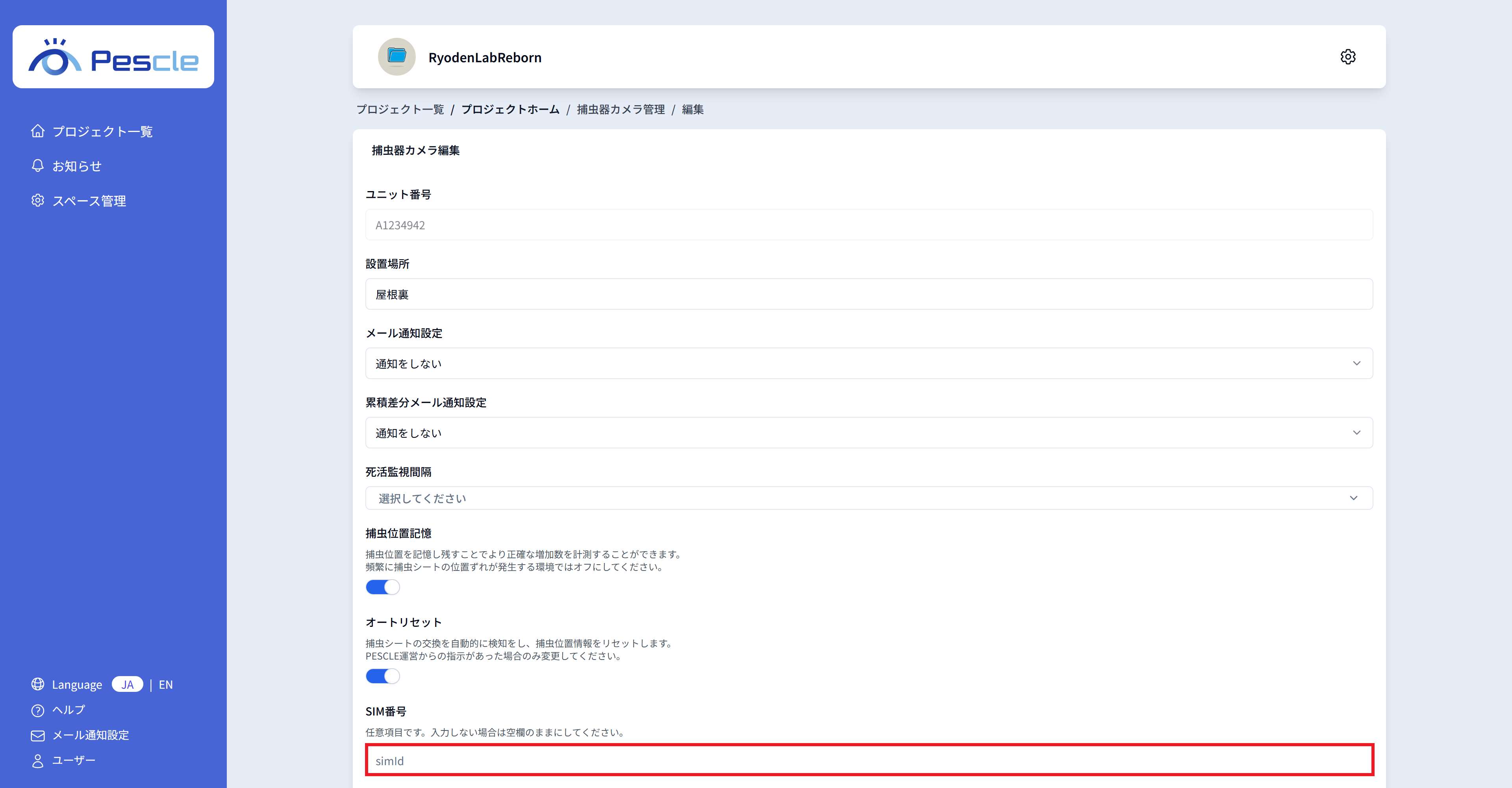 捕虫器カメラの SIM 番号を入力することが可能です。 任意ですので、不要であれば入力が無くとも問題ありません。