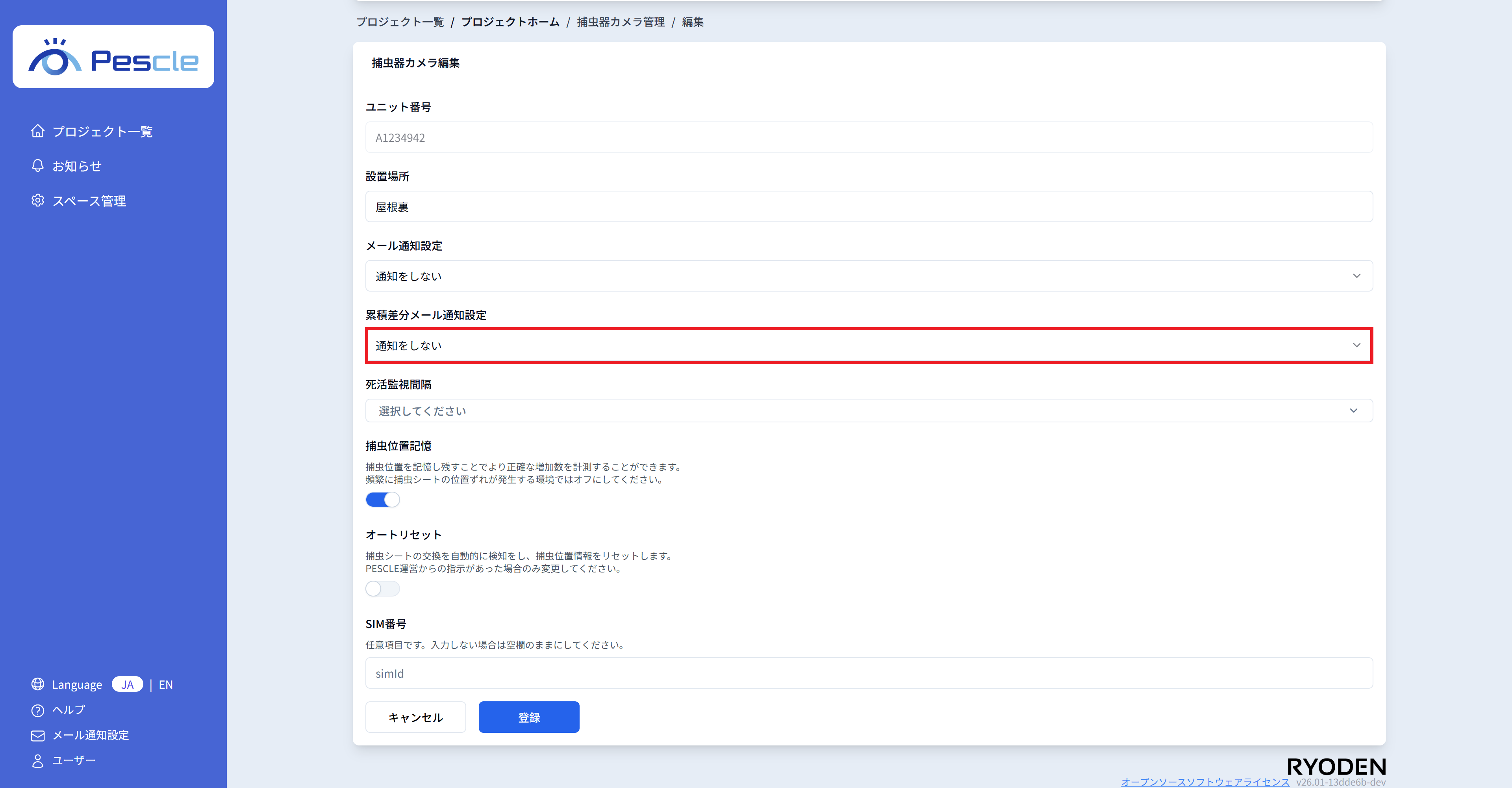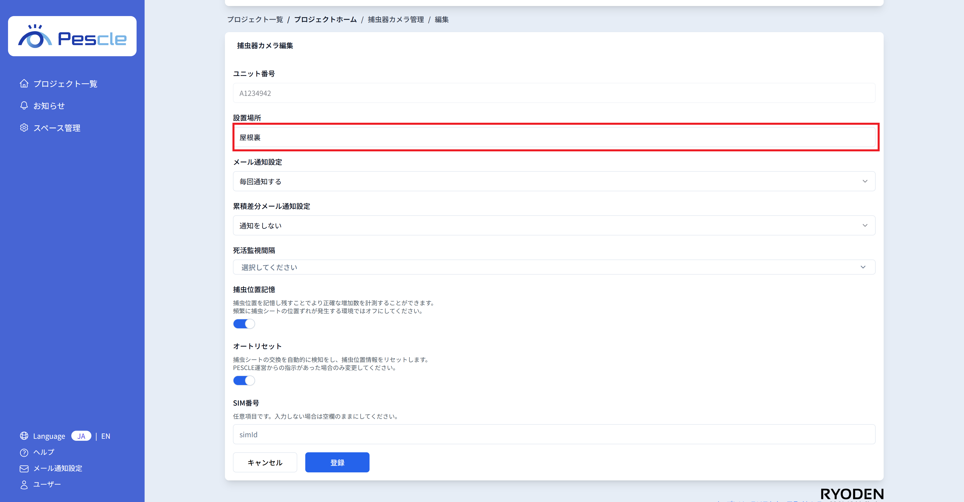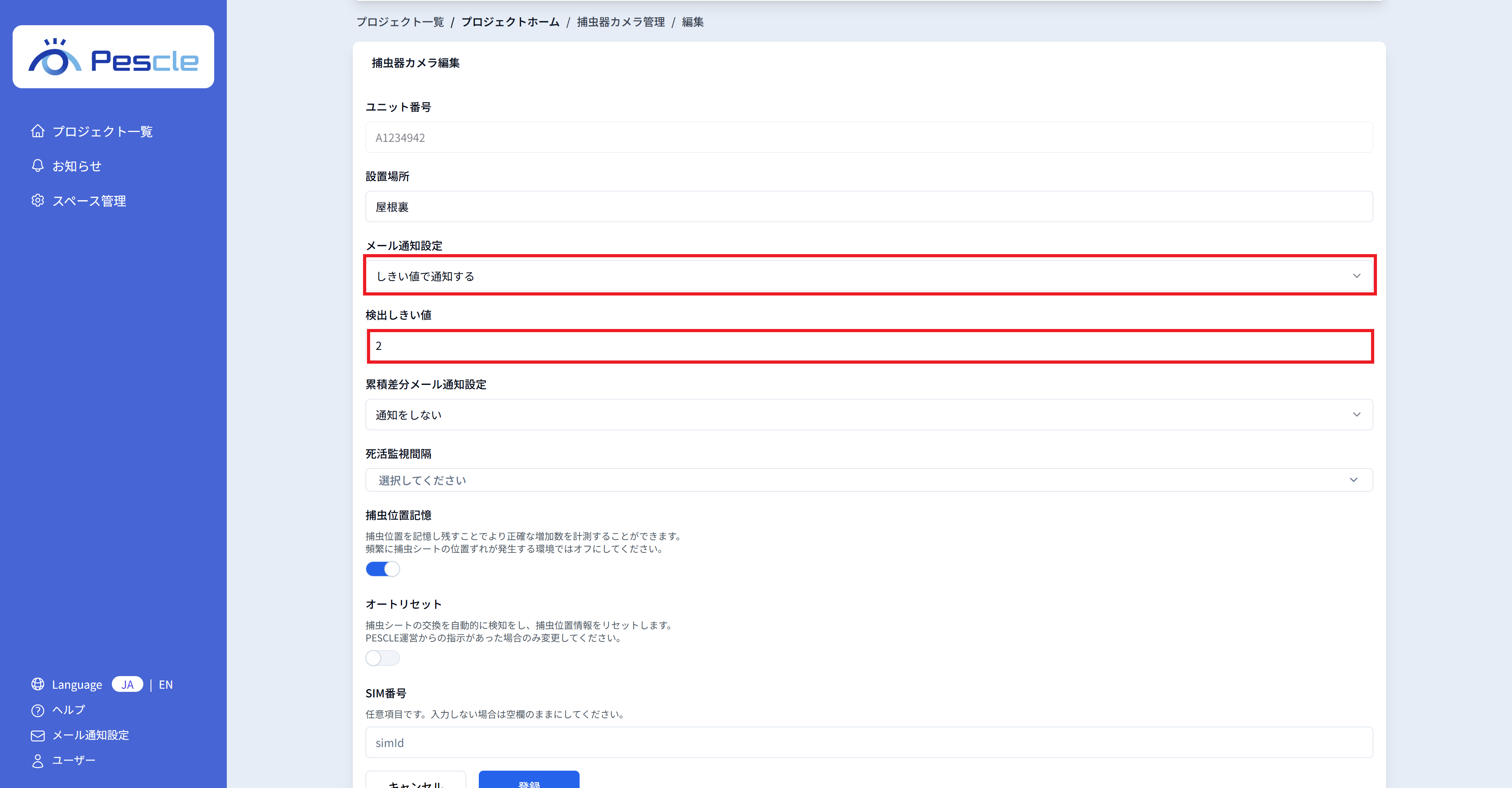 捕虫器カメラの SIM 番号を入力することが可能です。 任意ですので、不要であれば入力が無くとも問題ありません。
