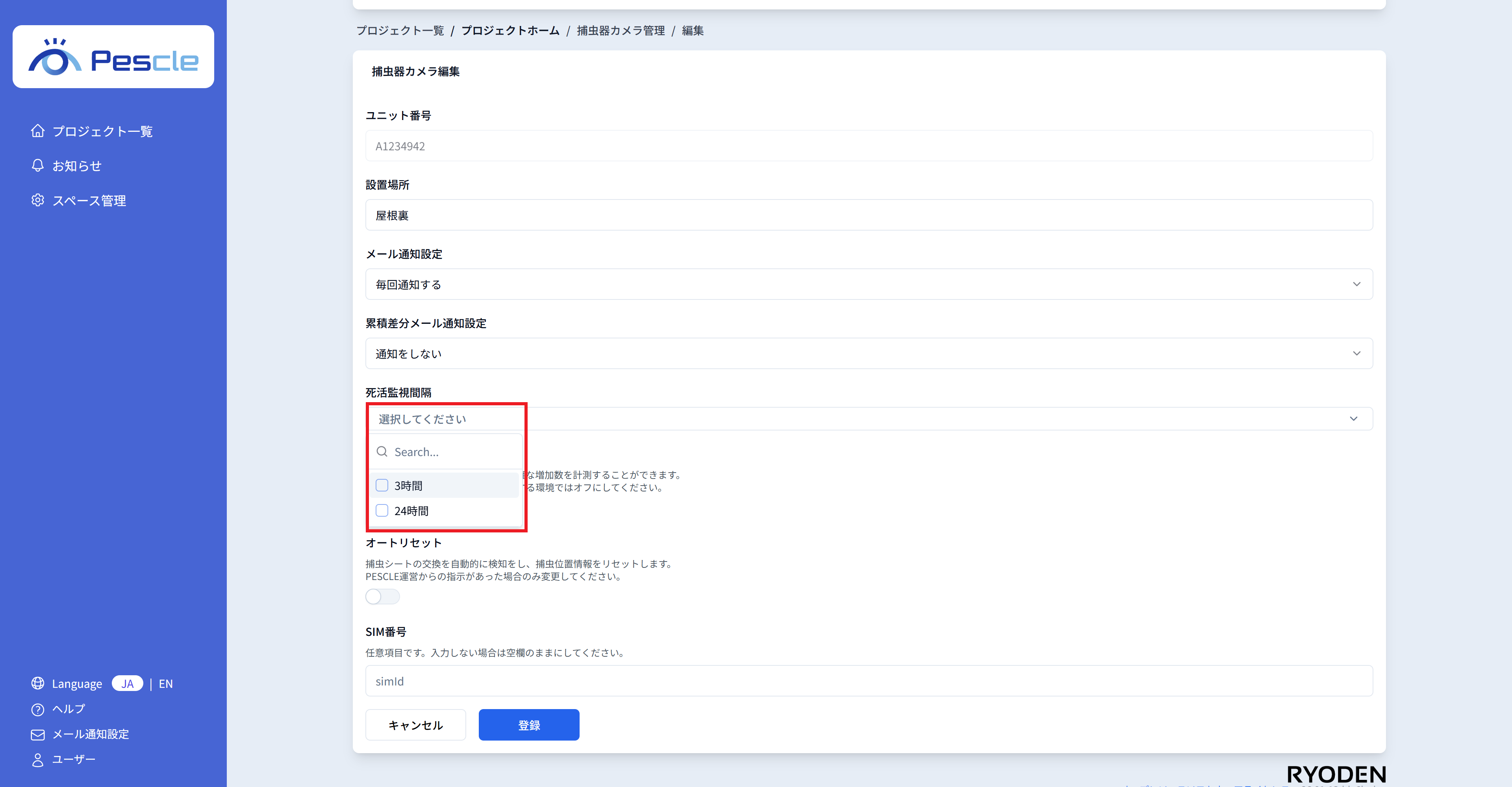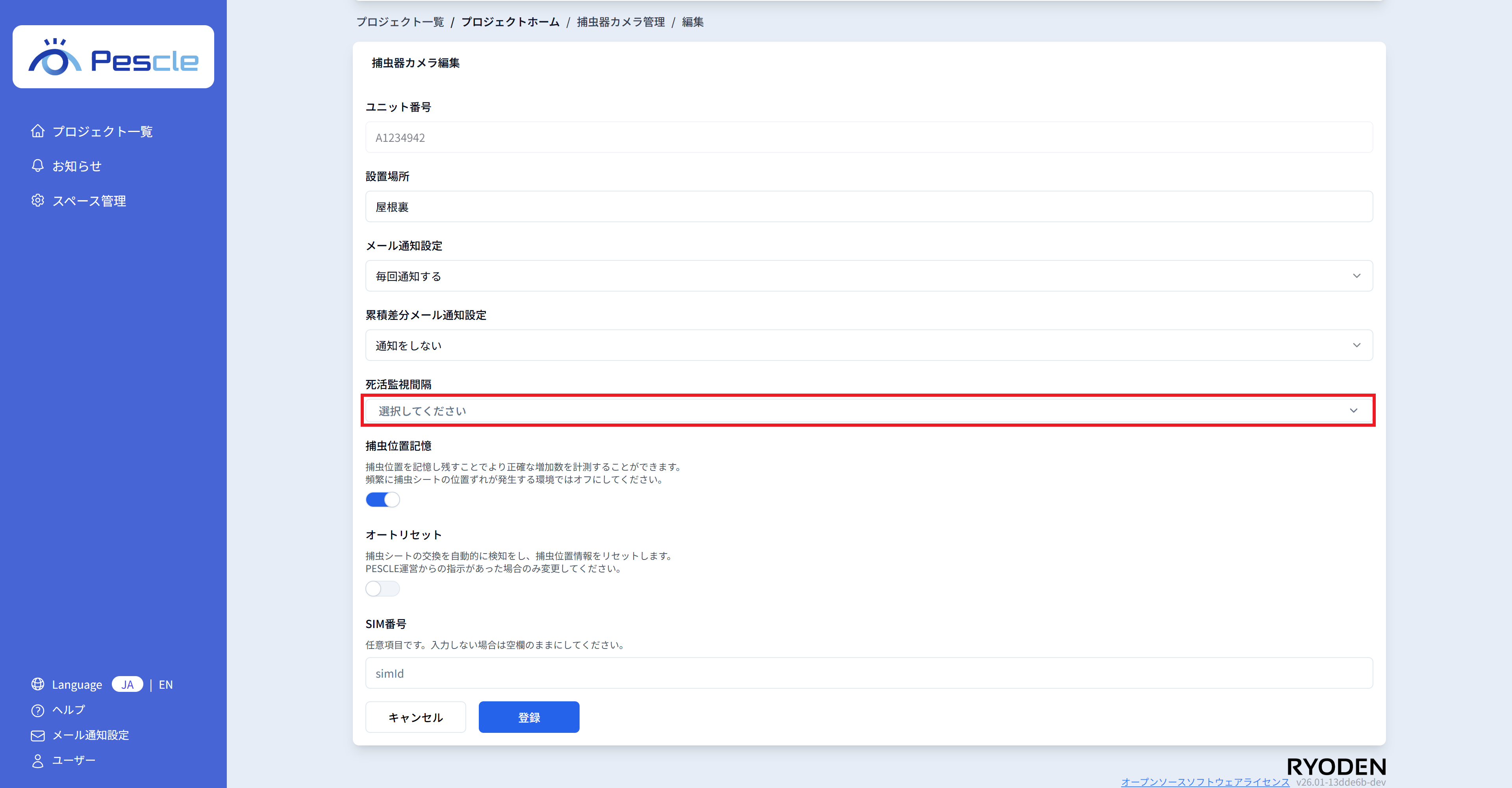 死活監視設定を設定することにより、捕虫器カメラが正常に動いていない場合に、プロジェクト管理者へメール通知することができます。