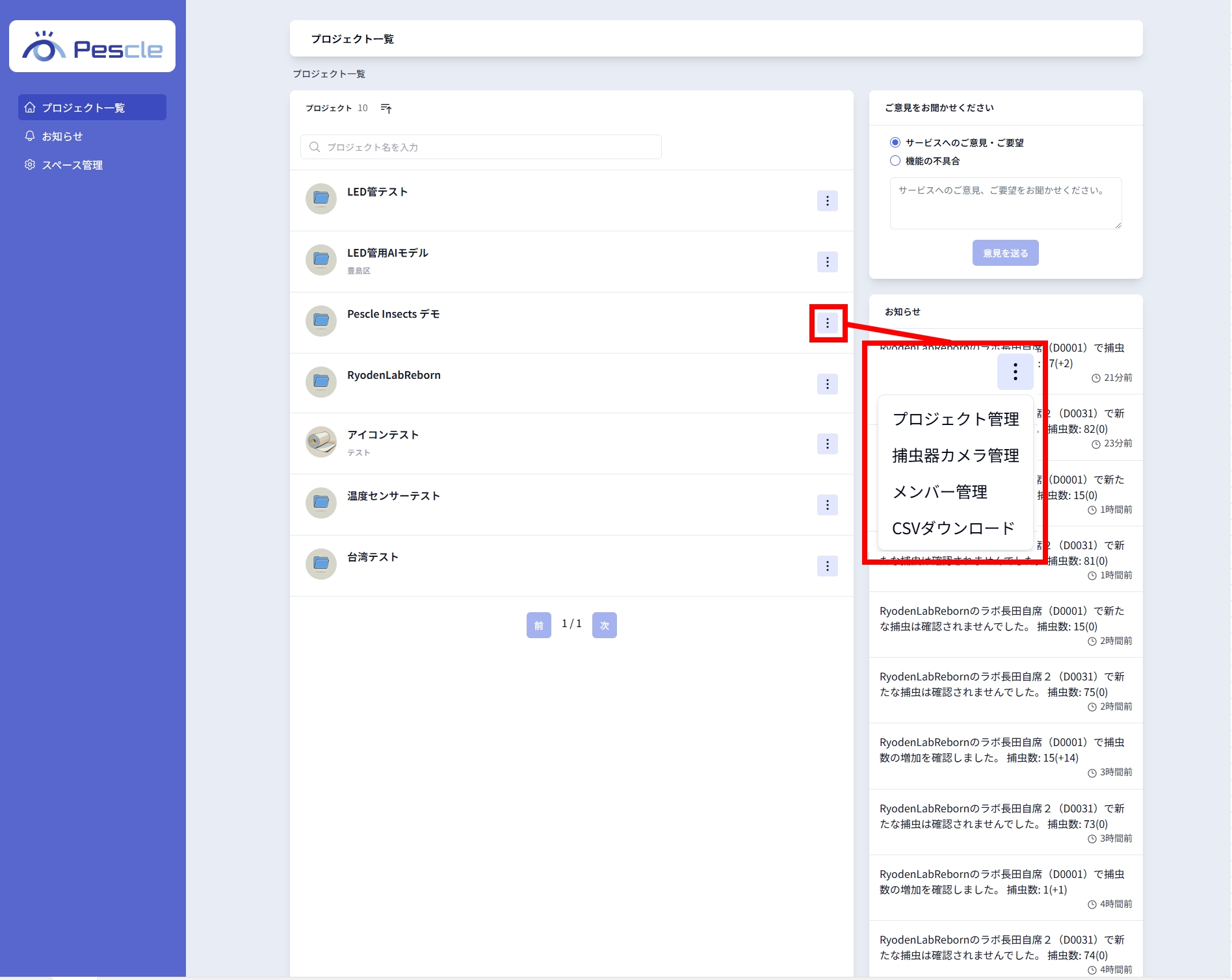 削除したい捕虫器カメラが所属するプロジェクトの右側にある縦三点リーダーをクリックします。