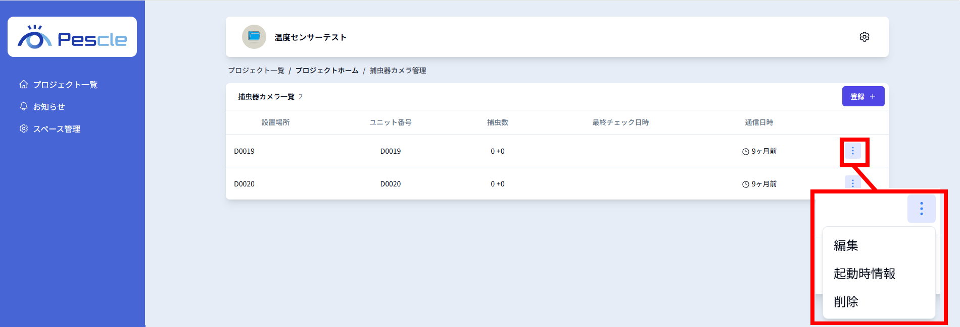 捕虫器カメラ管理画面が表示されたら、対象の捕虫器カメラの右側にある縦三点リーダーをクリックします。
