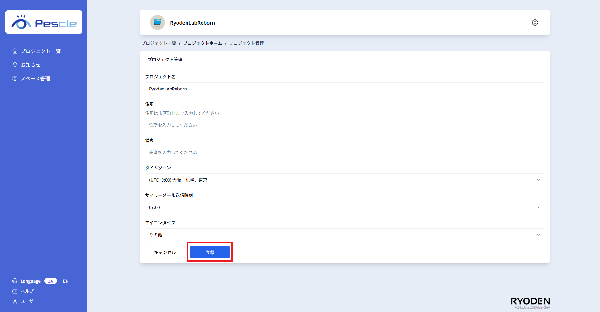 プロジェクト設定変更画面が表示されるので、プロジェクト名、住所、備考、タイムゾーン、サマリーメール送信時刻、アイコンタイプを入力します。 入力が完了したら、 「登録」 ボタンをクリックします。