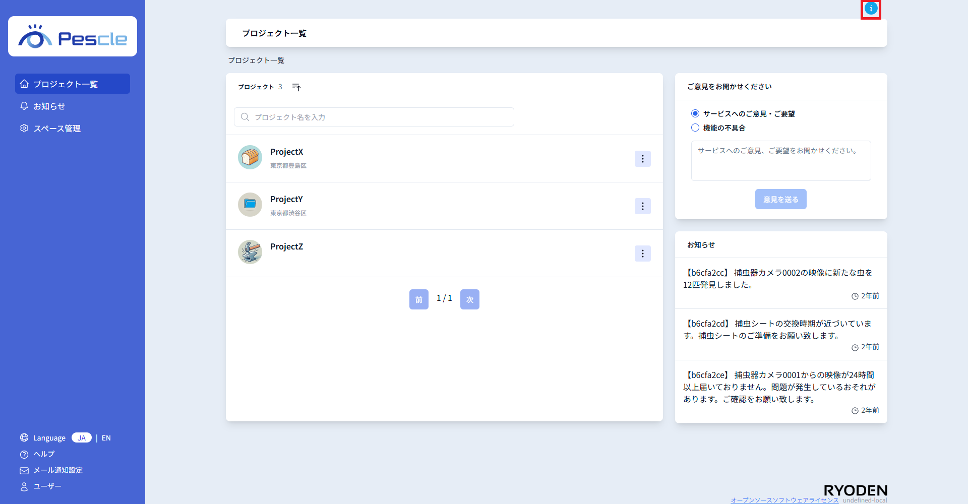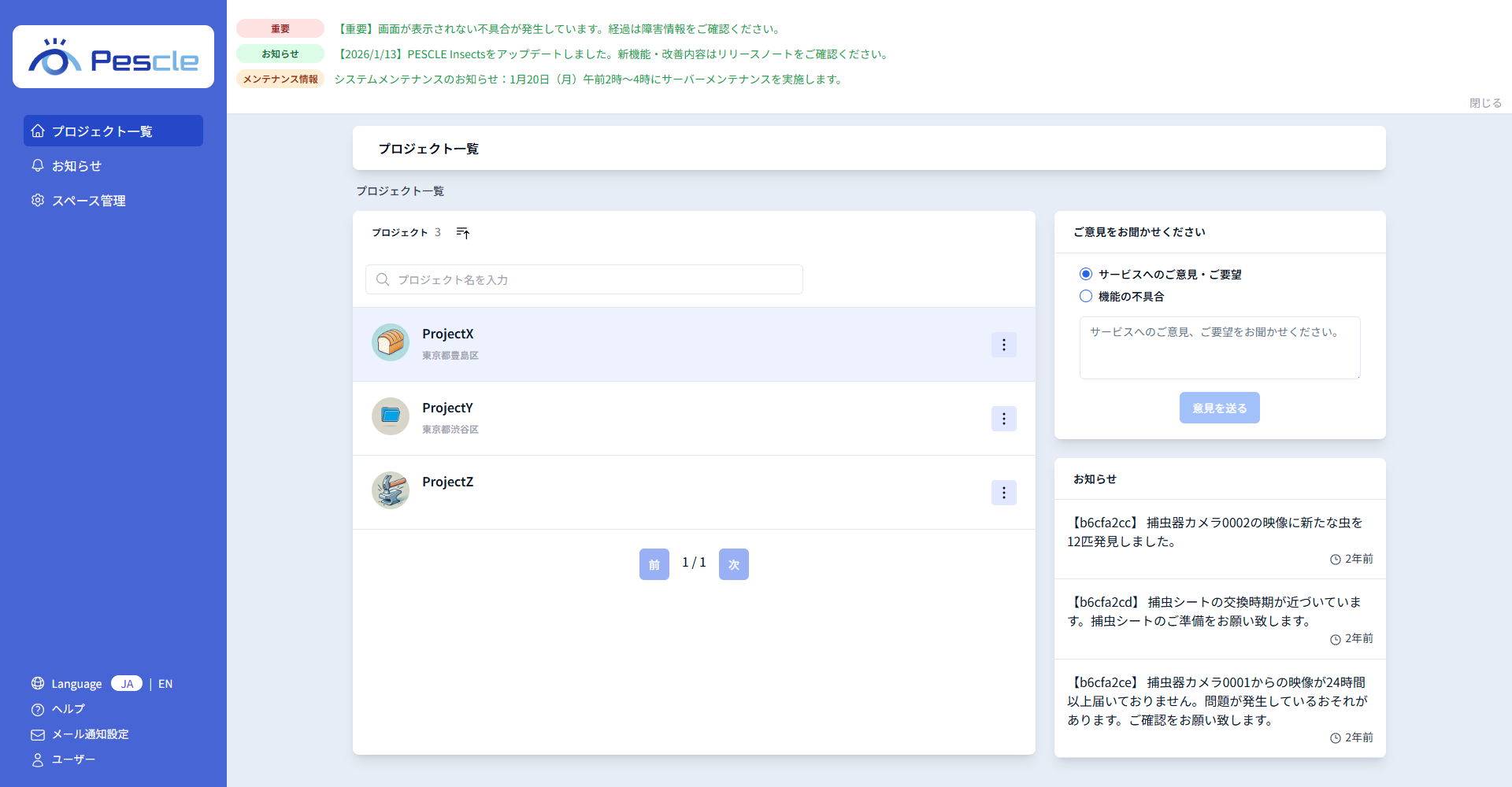 プロジェクト一覧画面では、お客様へのご案内を表示することがあります。