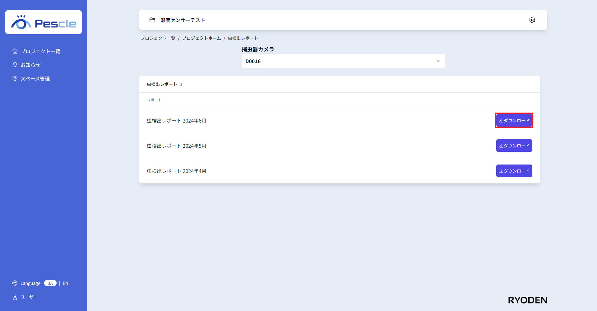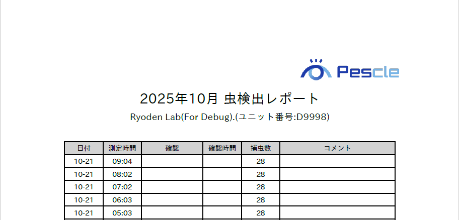「虫検出レポート」画面では虫検出レポートを月毎にPDF形式でダウンロードできます。