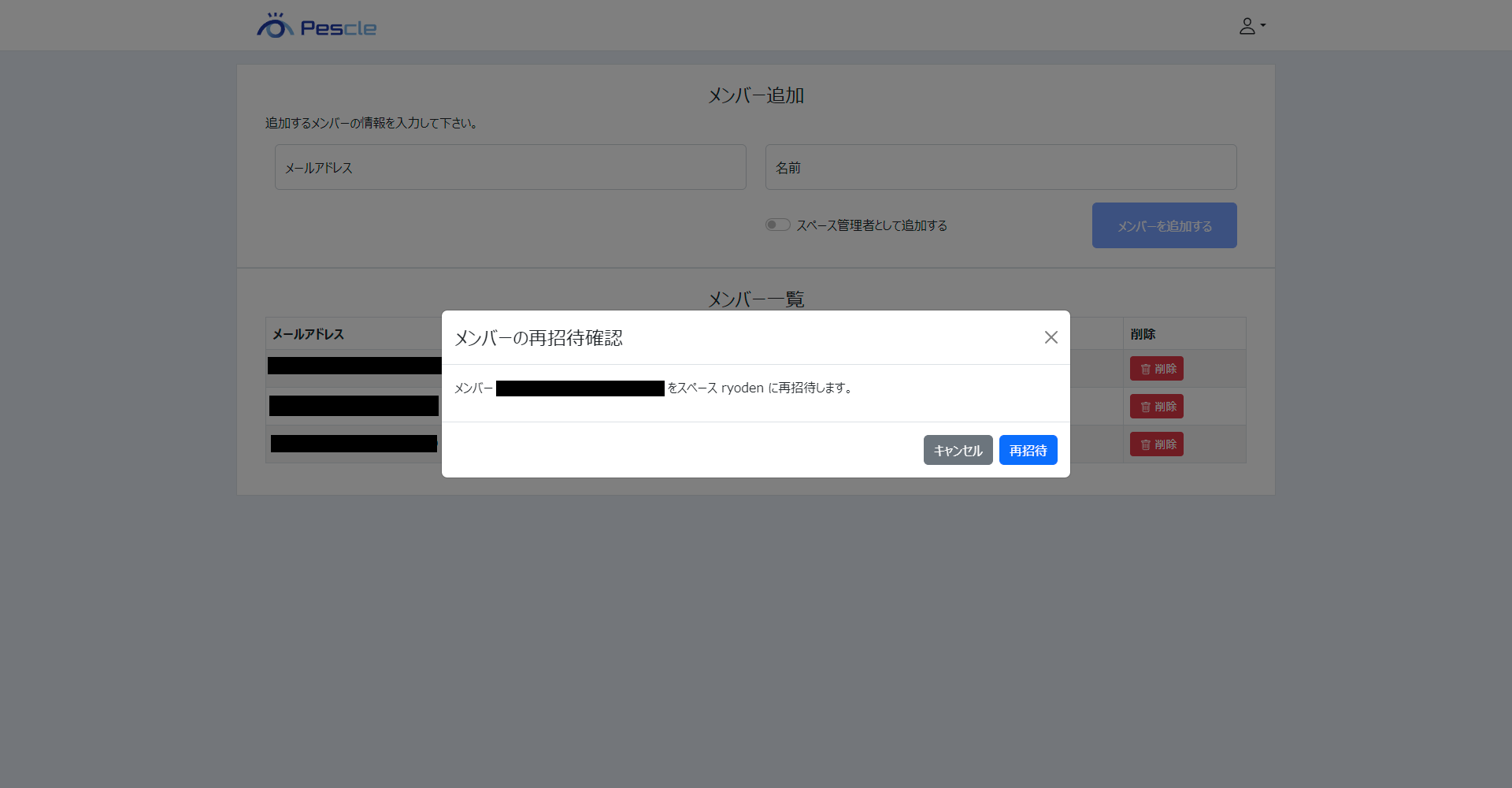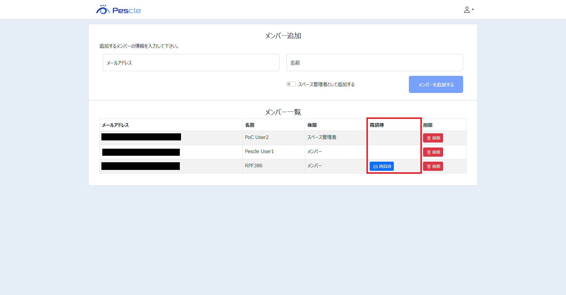 メンバーのメールアドレスを確認して「再招待」ボタンをクリックしてください。