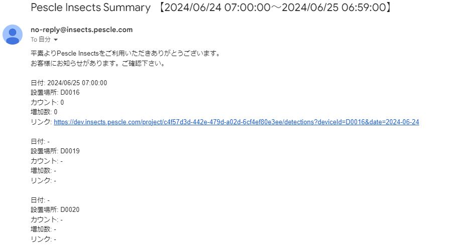 プロジェクト内の全捕虫器カメラに対して、虫検出カウントをサマリーしたメールをサマリーメールと表記しています。